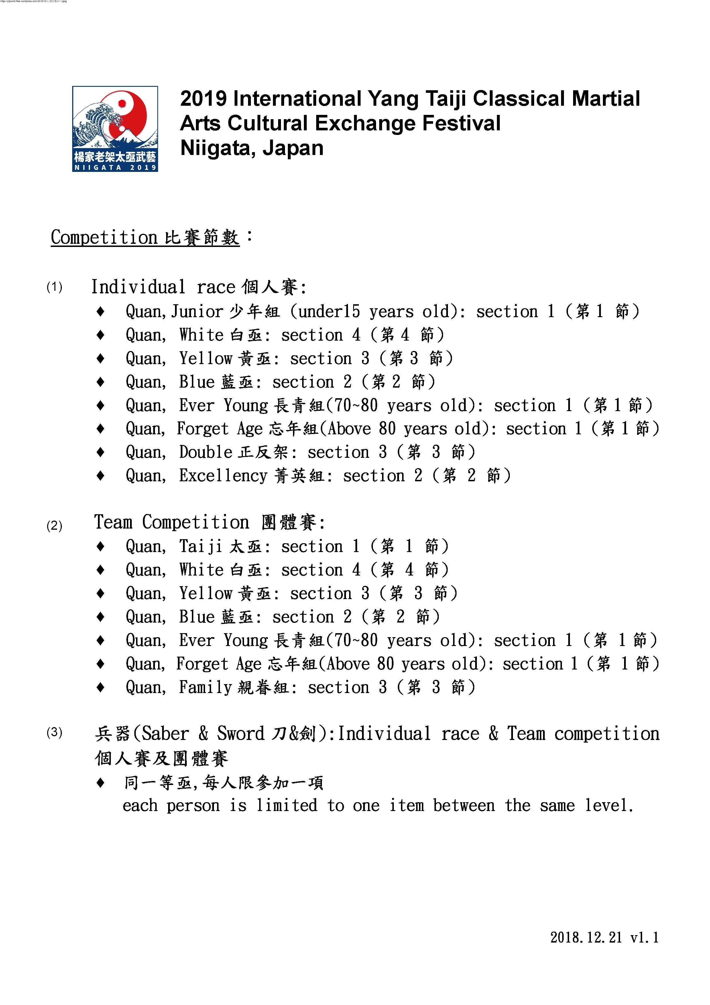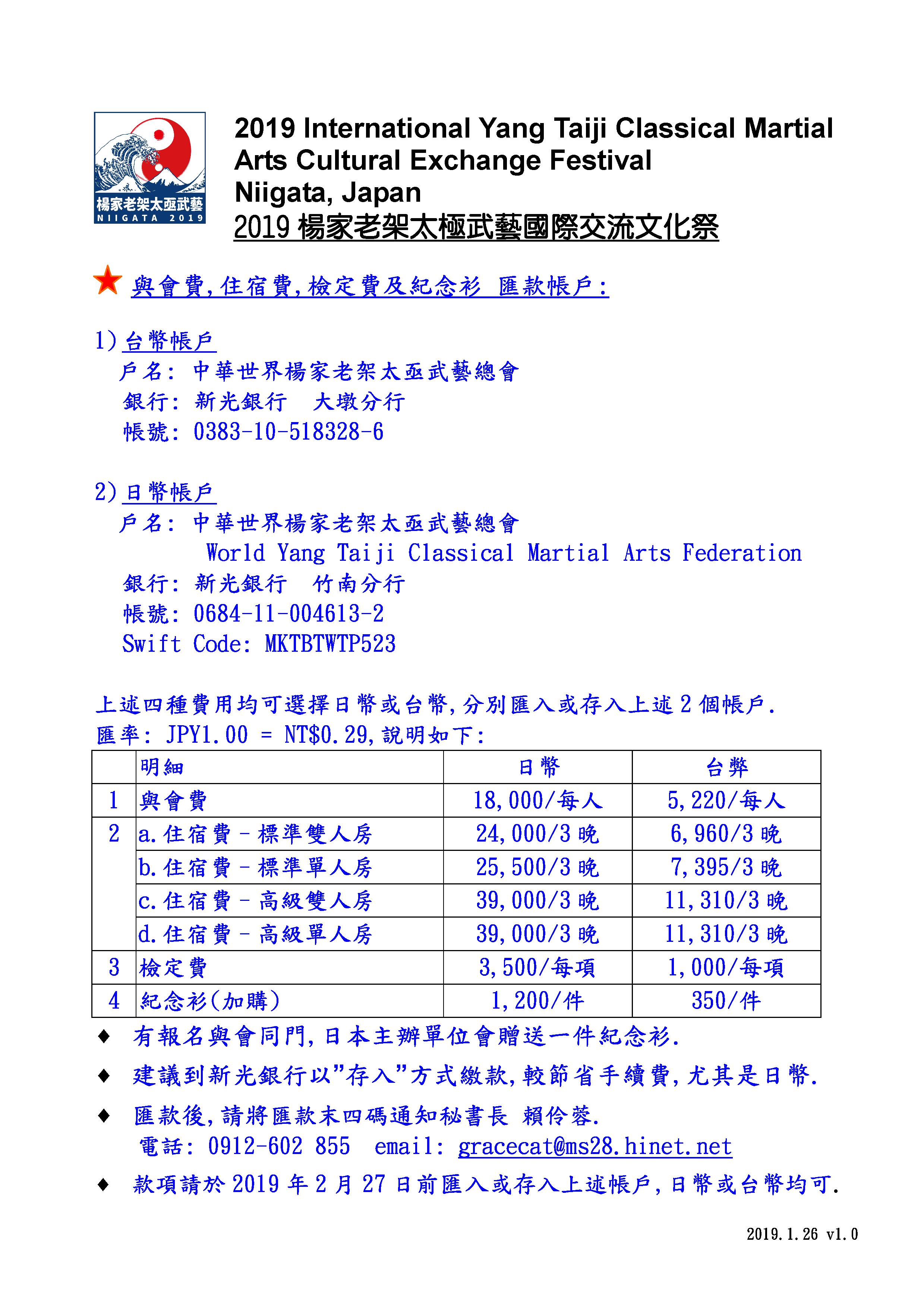 2019楊家老架日本新潟(Niigata)太亟文化祭-NEW文件 2018-12-14 日本新潟文化祭資料 :(2019/01/29更新) [1]行程表 [2]檢定資料 [3]銀行資訊 (2019/01/29) [4]申請表(EXCEL) [5]比賽節數V1.1 [所有資料下載] 其他連結:【 前往 楊家老架日本新潟太亟文化祭 主頁】